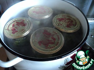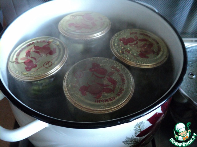 Банки моем, прокаливаем в духовке при температуре 170 градусов-15 минут. Огурцы перемешиваем несколько раз и выкладываем в банки. Заливаем их до половины уровня банки образовавшимся соком.