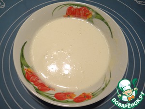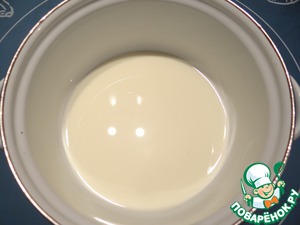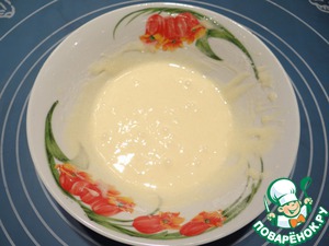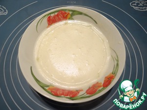 Массу взбиваю, снова нагреваю в микроволновой печи в течение минуты и опять взбиваю. Даю массе чуть остыть, накрываю пленкой до полного остывания, чтобы сверху не образовалась сухая корочка.