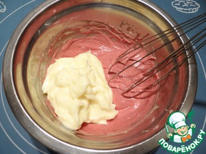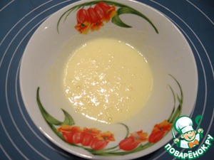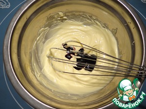 В желтковую массу добавляю сначала 2 столовые ложки закипевшего молока, взбиваю. Затем добавляю оставшееся молоко, опять взбиваю массу.