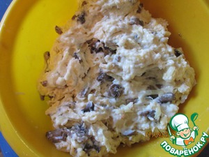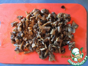 Грибы мелко порезать, обжарить на масле. У меня в морозилке всегда есть жареные грибы в запасе (например для пиццы), так что мне жарить не пришлось, только покрошить.