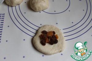 Далее берем колобок, раскатываем его слегка., не тонко. Кладем начинку на середину. Сахар не добавляем. Можно взять другую начинку, не сладкую, например яйцо с луком.