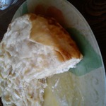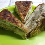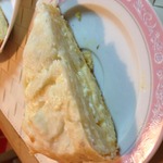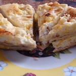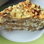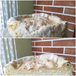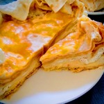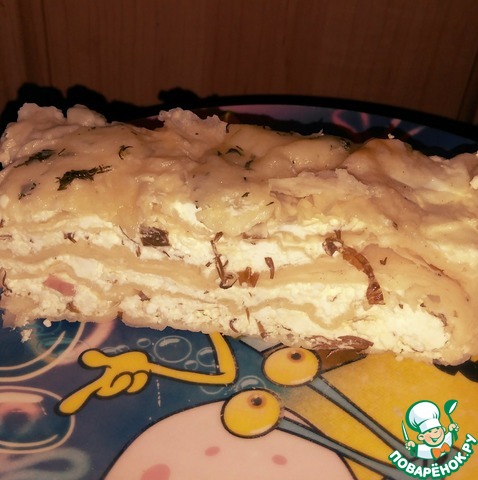Следующий слой - мягкий сыр (у меня были остатки чего-то), лаваш в кефирной заливке.