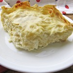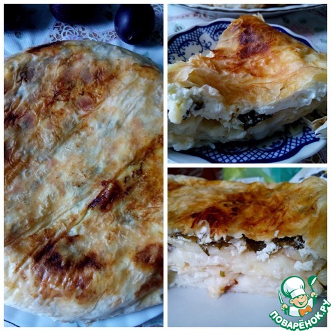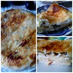 Посыпаем нижний слой размятым сыром сиртаки (фета), сверху немного брынзы и чуть поливаем заливкой. Весь остальной лаваш рвём на кусочки (я резала ножницами на кусочки размером с ладонь), окунаем кусочки в кефирную смесь и укладываем на сыр.