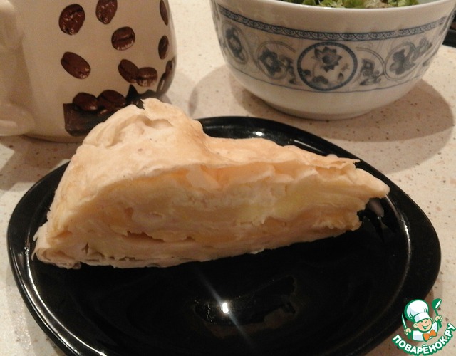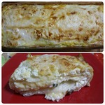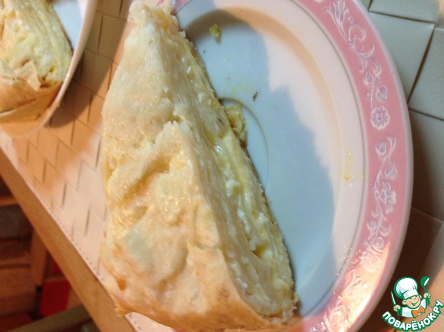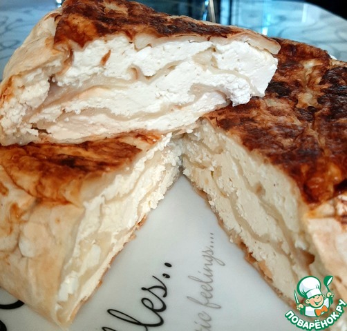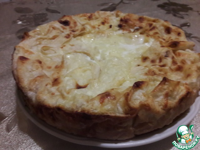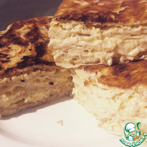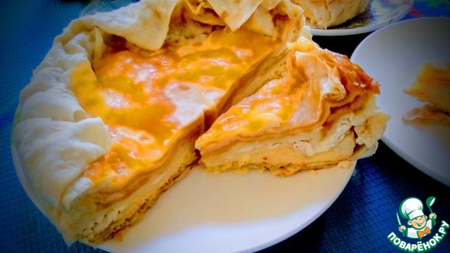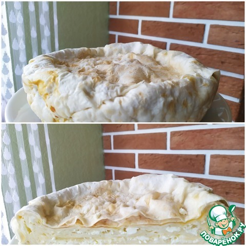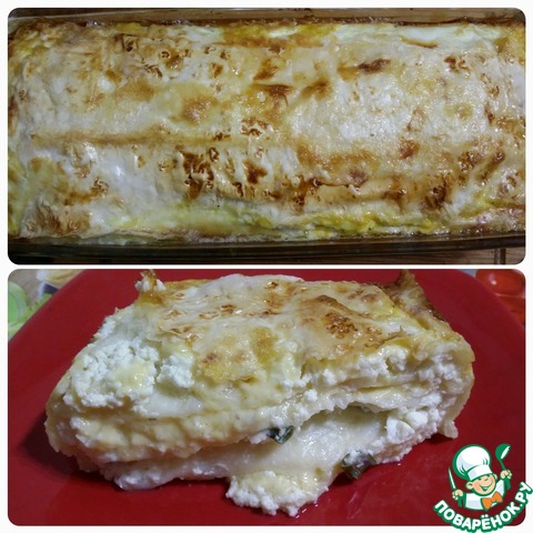 Следующий слой - сулгуни, немного моцареллы, лаваш в кефирной заливке.