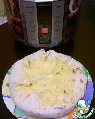 Чашу смазать мягким сливочным маслом. На дно выстилаем лист лаваша, чтобы получилась как бы небольшая мисочка из лаваша, у меня лаваш был очень тонкий, поэтому я еще выложила сверху листик размером по донышку.