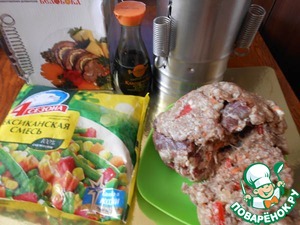 Овощную смесь разморозить, добавить пару столовых ложек соевого соуса, перемешать.