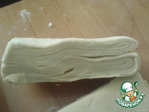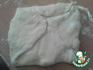Перед выпечкой наши заготовки раскатать в тонкие пышки, сложить в 4 раза и опять раскатать, присыпая мукой, т. е. опять прослоить (3-4 раза).