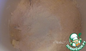 Всыпаем в чашу миксера муку (у меня смесь муки в/с и 1-го сорта в равных количествах), добавляем разрыхлитель, соль, ванилин (если решили добавить) и тщательно перемешиваем миксером, а затем руками.