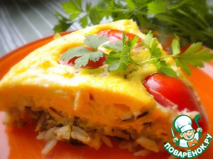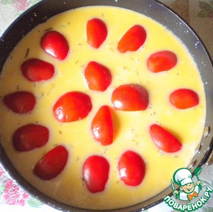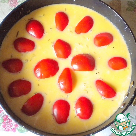 • Сковороду с рисом снимаем с огня и заливаем яично-сырной массой. Помидоры режем в зависимости от размера на 4-6 частей и раскладываем их сверху омлета.