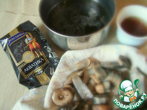 Достаем грибы и обсушиваем их на полотенце. Грибной бульон используем для приготовления риса. Заливаем 1 чашку дикого риса 3 чашками горячего бульона и варим на очень слабом огне 50-60 минут, пока большинство зернышек не раскроется. Еще одну чашку бульона оставим для приготовления соуса.