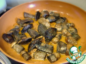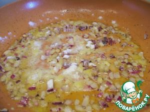 Грибы отложим в емкость с крышкой, чтобы сохранить их горячими. А в масле, на котором жарились грибы, обжариваем мелко нарубленный лук с добавлением 2-3 ч. л. муки.