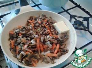 Лук и морковь добавляем к грибам. И туда же добавляем кусок сливочного масла. Посолить, хорошо перемешать. Через время ещё не много посолить и перемешать. (сильно грибы солить не нужно, потому что суп мы ещё будем солить).