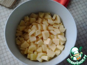 Пока грибы дожариваются, нарезаем картофель небольшими кусочками.