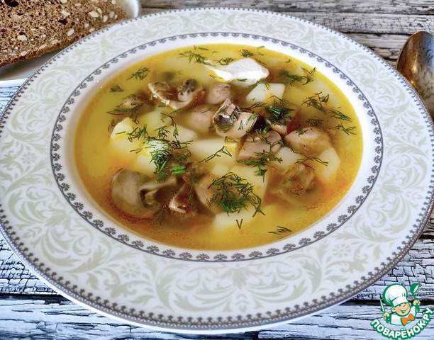 Ставим 3-х л кастрюлю с водой. Воду довести до кипения, затем добавить картофель, проварить до полуготовности, затем выкладываем грибы, еще немного солим, варим. В самом конце добавляем нарезанный укроп (по желанию). Суп готов. Приятного аппетита! P.S. извините за качество фотографий.