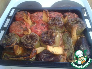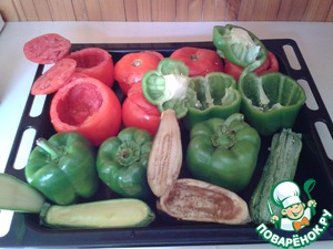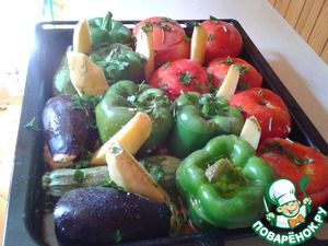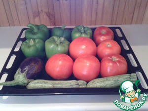 Предварительно вымытые овощи ( помидоры, перец, кабачки и баклажаны) укладываем в глубокий жаропрочный противень.