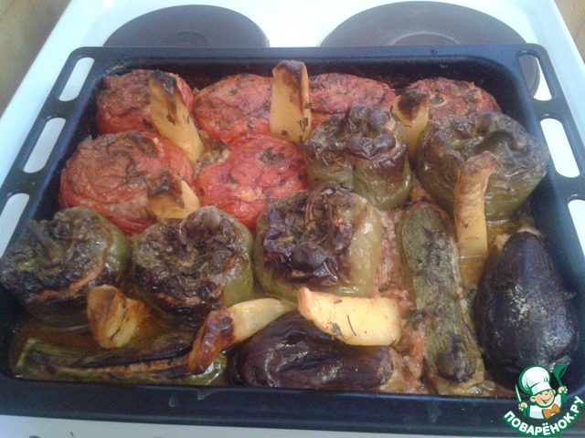 Помещаем в духовой шкаф при 180 ' на 1,5 часа. Крышечки овощей должны подрумяниться, а рис стать мягким и сочным. Подается на стол в охлажденном виде, хорошо сочетается блюдо с сыром " фета" и маслинами. Приятного аппетита!
