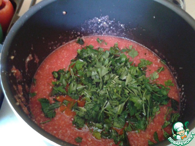 Крупно режем лук и помещаем его вмете с "овощными внутренностями" в блендер. В получившуюся кашицу добавляем рис, оливковое масло, соль, сахар, перец.