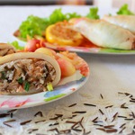 Фаршированные кальмары с пикантным овощным гарниром с яблоками или ранетками.