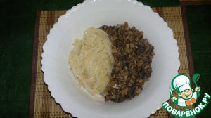 В блюдо выкладываем курицу (рвем на волокна), шампиньоны (жареные с луком) и собственно сам лук (жареный полукольцами).