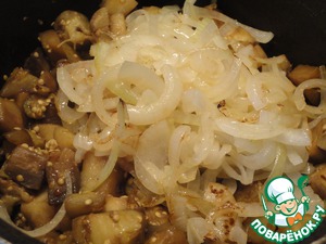 Лук отправляем к баклажанам. Стараемся переложить лук так, чтобы масло по максимуму оставалось на сковороде, где он жарился. Это нужно, чтобы икра вышла не сильно жирной. Перемешиваем лук и баклажаны, накрываем крышкой и тушим дальше.