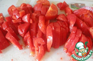 В промежутках, пока поджариваются лук, морковь и перец, с помидоров снимаем шкурку, режем полукружками.
