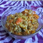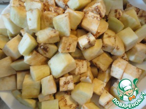 Для оптимального распределения времени и избежания перетушивания компонентов, сначала нужно подготовить ингридиенты. Баклажаны очищаем от кожуры и режем кубиками около 1,5 см. Если не любите острые баклажаны, то кубики солим, оставляем минут на 20-60, отжимаем и сливаем выделившуюся жидкость. Меня острота баклажан не пугает, поэтому я их пока не солю.