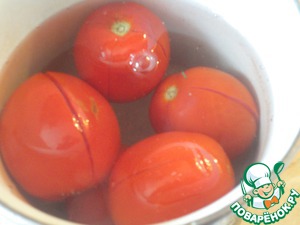 Помидоры надрезаем крестообразно. Заливаем кипятком минуты на 1-3.