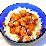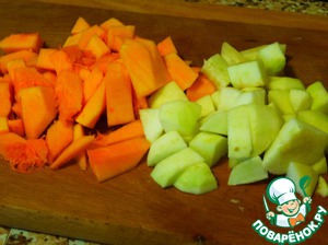 Пока варится рис, необходимо нарезать кубиками тыкву и яблоко