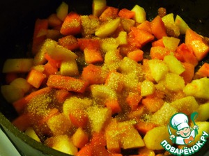 Добавляем сахар с корицей и карамелизуем полученную смесь.