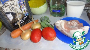 Для приготовления этого блюда нам потребуются: Рис "Басмати mix" ТМ Мистраль, одна тыква небольшого размера, репчатый лук, морковь, капуста брокколи, небольшой кусок мяса (у меня свинина), сливки, белое сладкое вино и растительное масло для обжарки овощей.