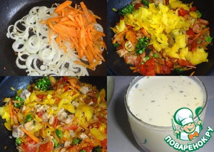 Сверху добавить приготовленную заливку и натёртый на мелкой тёрке твёрдый сыр. Накрыть крышкой и поставить в духовку на 1 час. при температуре 200 гр. С, потом крышку снять и оставить ещё на некоторое время, чтобы сыр подрумянился. -