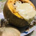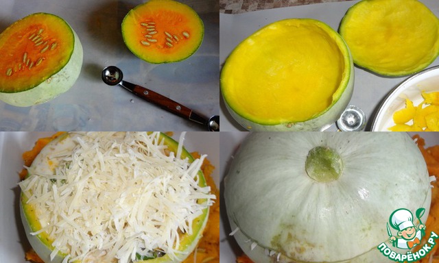 У тыквы срезать крышечку и освободить серединку с помощью специального приспособления - нуазетки или обыкновенной ложки, стараясь не проткнуть кожицу. Заполнить тыкву обжаренными овощами, мясом и рисом.