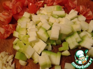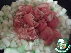 • Кабачок нарезаем на кубики и помидоры, чеснок мелко измельчаем, чеснок обжариваем на растительном масле, далее обжариваем и помидоры, солим, перчим.