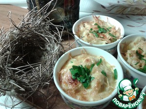 • Разложим подготовленные компоненты продуктов в кокотницы, слоями, зальем сливками и посыпаем натертым сыром, запечем в духовке до золотистой корочки.