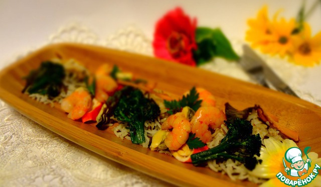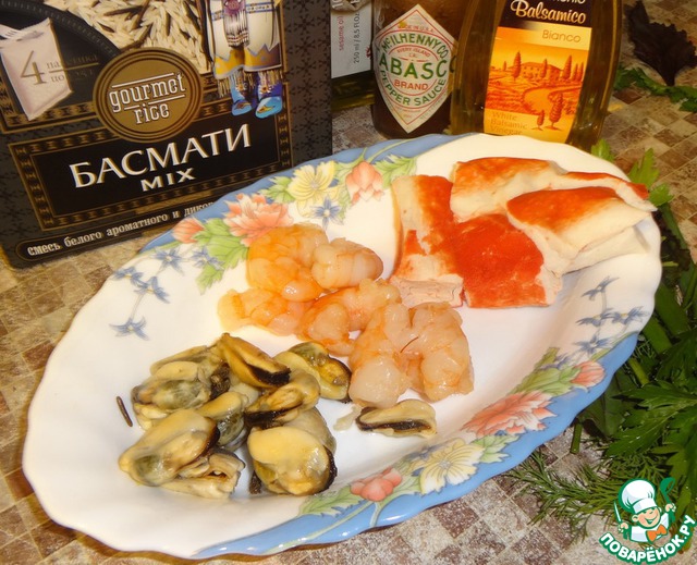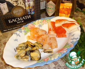 Отварить отдельно рис "Басмати mix". Отварить, если вам достались сырые морепродукты и крабовое мясо.