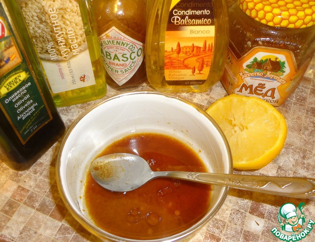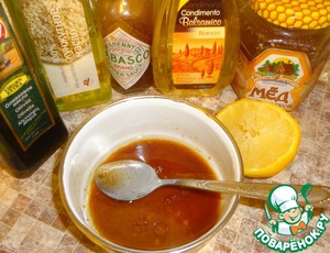 Для заправки нашего блюда нам нужно: масло оливковое - 1ст. л. масло кунжутное 1ст. л., бальзамический уксус 1ч. л., сок лимона1ч. л., мед 1 ч. л., рыбный соус 2 ст. л. и соевый соус 2 ст. л. Смешать все ингредиенты в чашке и слегка взбить вилкой, чтобы они хорошо смешались.