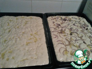 Я сегодня делала двойную норму теста на две фокаччи. Одну - с оливковым маслом и с солью, вторую - с луком. Для луковой фокаччи: поливаем фокаччу оливковым маслом, посыпаем солью, нарезаем лук тонко полукольцами и укладываем поверх теста.