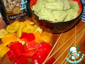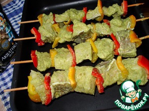 На шпажки нанизываю поочередно кусочки рыбы с болгарским перцем.