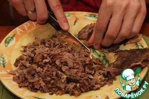 • Освободите готовое мясо от косточек и порежьте мясо кубиками.