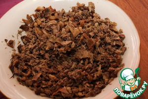 • Замочите грибы в теплой воде (не менее 2-х часов). После отварите в этой же воде в течение 5 минут и порежьте. Бульон не выливайте, он может понадобиться.
