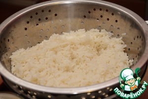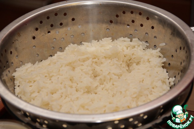 • Отварите промытый рис в подсоленной воде в течение 15 минут и откиньте на дуршлаг.