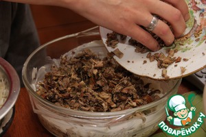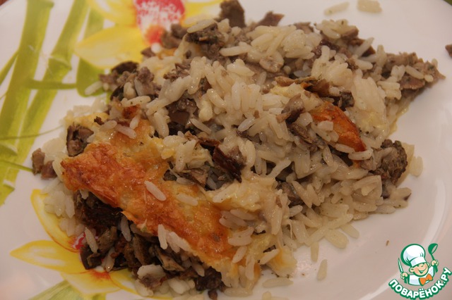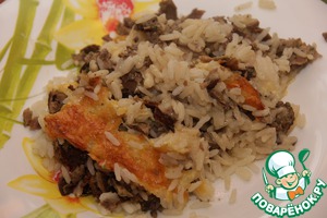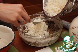 • Выложите слоями, аккуратно разравнивая, сначала рис, потом мясо с грибами, затем опять рис.