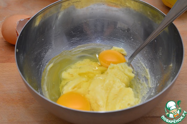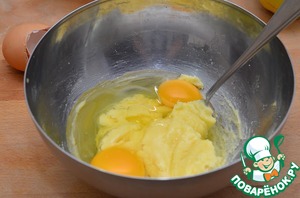 Итак, нагреваем духовку до 180 С. Пока духовка нагревается, в это время взбиваем масло (чуточку растопленное), сахар и яйца, хорошо все перемешиваем. ( Яйца желательно комнатной температуры, так пирог будет пышнее.) После добавляем ванильную эссенцию. Перемешиваем хорошо.
