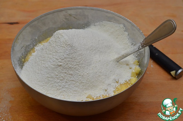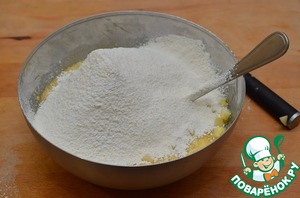 Добавляем к яично-масляной смеси. Перемешиваем, добавляем муку с разрыхлителем и снова перемешиваем. Должно получится не крутое тесто. (вместо яблок можно добавить груши или изюм с орешками).
