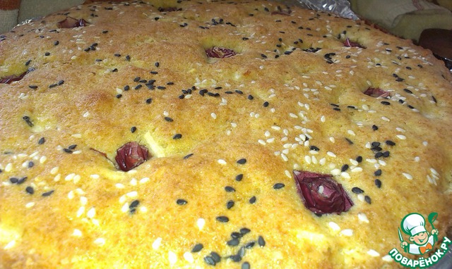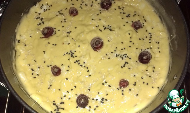 Смазываем форму сливочным маслом ( у меня разъёмная форма и широкая 28 см.) Теперь после того как смазали форму, можно выливать тесто в форму. Разглаживаем кулинарным шпателем или ложкой и украшаем кому как нравится, я украсила кунжутом белым и черным, а также мини розочками из яблок.