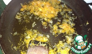 А пока наш бульон и картофель варится, делаем зажарку. Лук режем мелко, морковку трем на мелкой терке. на разогретую сковородку наливаем совсем немного растительного масла и я еще добавляю столовую ложку сливочного масла. Обжариваем лук и морковь.