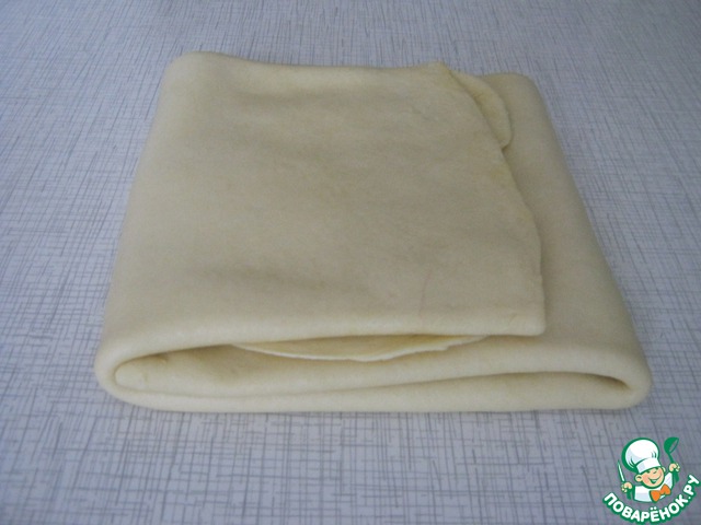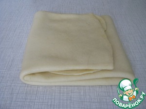 Через 30 минут тесто достать, раскатать в пласт, смазать растительным маслом по всей поверхности, сложить конвертом и снова убрать в пакет и в холодильник на 20 минут, эту процедуру повторить желательно 2-3 раза ( как раз - пока маринуется мясо).