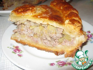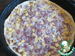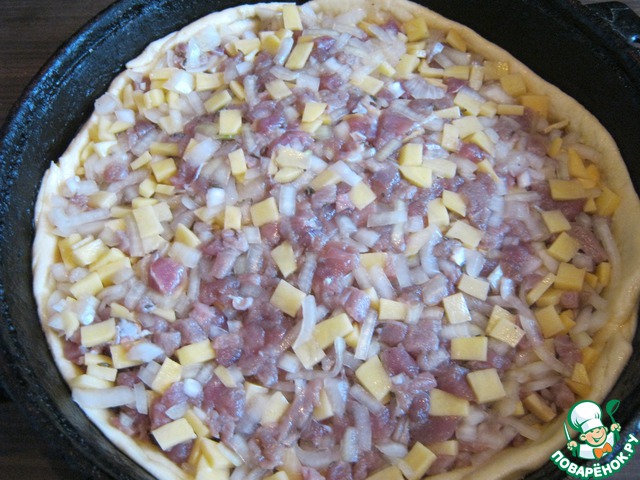 Картофель и 2 луковицы нарезать кубиком, посолить и поперчить, смешать с замариновавшимся мясом. Готовое тесто разделить на 2 части ( одну побольше, другую поменьше). Большую часть теста раскатать и уложить на смазанный маслом противень, форму, сформировать бортики (я использовала чугунную сковороду). Сверху уложить начинку, придавить её немного пальцами.
