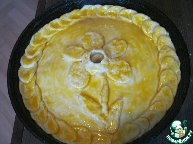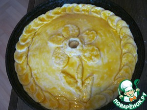 Оставшуюся часть теста раскатываем и накрываем начинку, защипываем края. В серединке делаем небольшую дырочку. Украшаем наш пирог. Смазываем желтком. В оригинале дырочка затыкается кусочком теста или луковкой, внутрь пирога добавляется бульон. Я ничего такого в данном рецепте не делаю. В дырочку выливаю оставшийся после маринада сок и отправляю в разогретую до 200 градусов духовку да покрытия пирога румяной корочкой.
