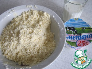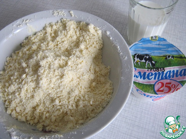 Для теста. Замороженный маргарин натереть на крупной тёрке и смешать с 2 стаканами муки - перетереть пальцами в крошку. Добавить сметану, молоко, уксус - хорошенько перемешать, порциями добавляя муку замесить тесто. Скатать тесто в шар, сложить в пакет и оставить в холодильник на 30 минут.